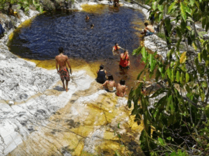 O percurso de pouco mais de sete quilômetros, a partir do centro de Macambira, passa por uma estreita estrada vicinal. Moradores locais preservaram a indicação da distância e percurso, o que facilita a vida de quem pretende visitar o local pela primeira vez. outra referência muito marcante é a porteira da Fazenda Guadalupe, além de uma série de mata-burros encontrados pelo caminho. Ao chegar, a pessoa espera encontrar uma queda d’água acima do nível em que se encontra, contudo, para se banhar na cachoeira, é preciso descer.