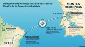 A simetria geográfica não para na toponímia. Enquanto o nosso “Velho Chico” nasce na Serra da Canastra, a 1.200 metros de altitude, e percorre cerca de 2.800 km até o Atlântico, o Mondego faz um percurso de 258 km, mas com importância estratégica equivalente para Portugal. Ambos são rios da unidade e da identidade nacional, artérias que interiorizaram o desenvolvimento e hoje sustentam perímetros de irrigação vitais, garantindo a segurança hídrica e a produção agrícola em suas regiões. Um dado que impressiona o olhar do geógrafo é a conexão oceânica. Visualizo uma linha imaginária saindo da nascente do Mondego nos Montes Hermínios e chegando diretamente à foz do Rio São Francisco, entre Sergipe e Alagoas, separadas por uma distância geodésica de aproximadamente 6.150 quilômetros pelo mesmo Oceano Atlântico.