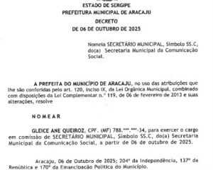A jornalista Gleice Queiroz é a nova secretária de Comunicação de Aracaju. Ela foi nomeada pela prefeita Emília Corrêa (PL) para substituir Ricardo Marques (Cidadania), que também é vice-prefeito da capital sergipana. A nomeação de Gleice foi publicada no Diário Oficial do Município do dia 6 deste mês. Na mesma edição está publicada a exoneração a pedido de Ricardo Marques