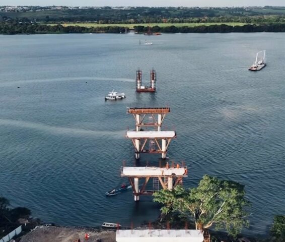 O avanço das obras da ponte que ligará os estados de Alagoas e Sergipe, entre os municípios de Penedo e Neópolis, foi registrado por imagens aéreas do GR Drone. As imagens mostram que os pilares de sustentação já se aproximam da margem penedense, indicando que a previsão do ministro dos Transportes, Renan Filho (MDB), de inaugurar a estrutura ainda em 2026, segue dentro do cronograma.
