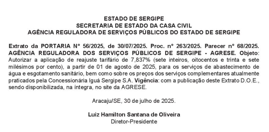 Desde a zero hora desta sexta-feira (1º), os consumidores sergipanos estão pagando mais caro pela água tratada e pelo esgotamento sanitário. O reajuste de 7,837% nos dois serviços prestado pela empresa Iguá foi autorizado pela Agência Reguladora de Serviços Públicos (Agrese). No mesmo percentual também foram reajustados “os serviços complementares atualmente praticados pela concessionária Iguá Sergipe”.