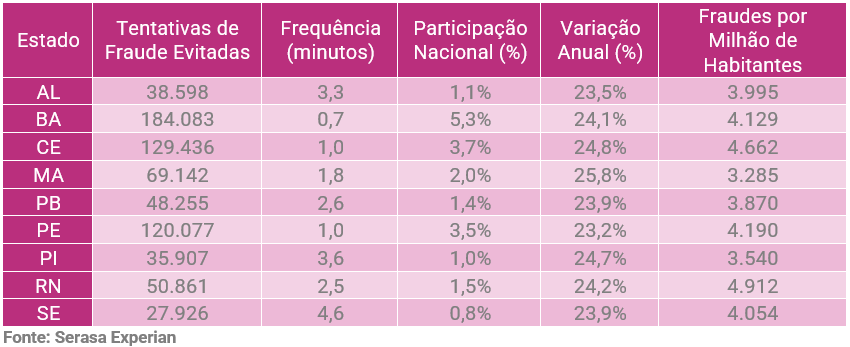 O Nordeste registrou 704.285 tentativas de fraude no primeiro trimestre deste ano, o que representa um aumento de 24,2% em relação ao mesmo período de 2024. Os dados são do Indicador de Tentativas de Fraude da Serasa Experian. A Bahia liderou com 184.083 tentativas, o equivalente a 5,3% do total nacional, seguida por Ceará (129.436) e Pernambuco (120.077). Na outra ponta, Sergipe apresentou o menor volume, com 27.926 registros.