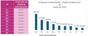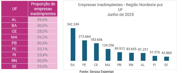 Alagoas registrou a maior proporção de negócios com contas em atraso (39,6%) em junho passado, enquanto o Piauí (25,4%) aparece com o menor número de empresas negativadas. Sergipe (29,4%) registrou 43.860 pessoas jurídicas com dívidas não pagas dentro do prazo contratado. Ao todo, no Nordeste são 1.213.919 empresas com débitos atrasados. Os dados são do Indicador de Inadimplência das Empresas da Serasa Experian.