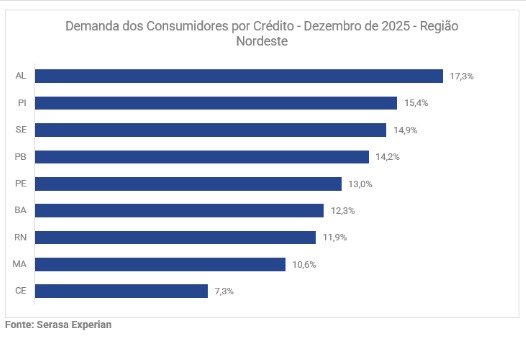 A procura dos consumidores por crédito no Nordeste fechou 2025 com alta em todos os nove estados, segundo dados do Indicador de Demanda dos Consumidores por Crédito da Serasa Experian. O maior crescimento foi em Alagoas, com 17,3%, enquanto Sergipe aparece na terceira posição: 14,9%.